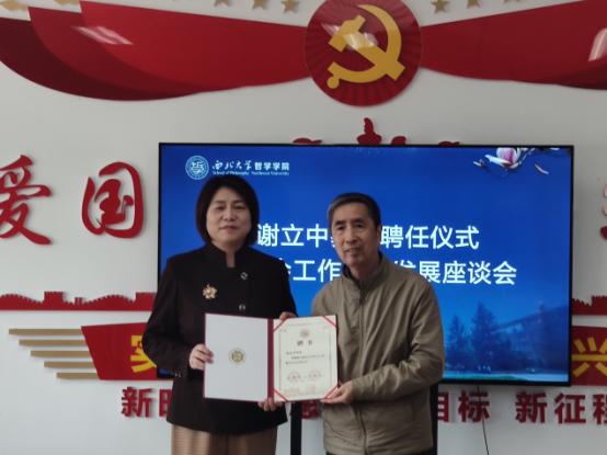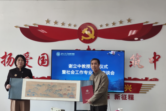 聘任仪式上,孙明哲主任首先介绍了谢立中教授的基本情况,与会教师代表也各自从个人履历、研究方向等方面做出自我介绍。党委书记李波向谢立中教授颁发“西北大学社会工作研究中心名誉主任“聘书,并赠送纪念品。